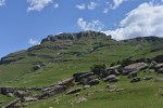 Nach mehreren Stunden Fahrt endlich die Abzweigung auf die Zufahrtsstrasse zum Cobham National Park. 20 km unsagbar schlechte Schotter- und Sandpiste – eine Herausforderung für Addo und uns. Und dann das Wetter. Nebel, Regen, Kälte. Sogar die sonst so lästigen Baboons (Paviane)  haben sich verabschiedet und sind in Ihren Felsnischen verschwunden. Nichtsdestotrotz – wir entschieden zu bleiben und den nächsten Morgen abzuwarten. Mit einem warmen Lagerfeuer, etwas Rotwein und Gegrilltem lässt sich auch ein solcher Abend eingemummt in 3 Pullover und Jacken aushalten. Und manchmal hat man Glück. Der nächste Morgen, strahlender Sonnenschein, unten in den Tälern der dichte Nebel. Also nichts wie rauf auf den Berg. Nach dem Frühstück gings los und wir bestiegen in völliger Einsamkeit einen der Gipfel der Drakensberge und wurden mit einem wunderbaren Panorama und der Sicht auf den Sanipass, einem der höchsten Pässe der Drakensberge entschädigt.